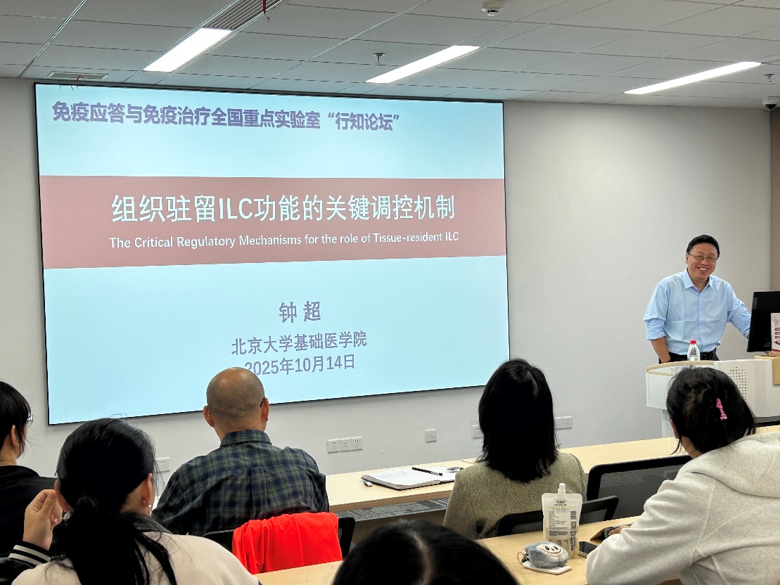 2025年10月14日上午,由中国科学技术大学生命科学与医学部、免疫应答与免疫治疗全国重点实验室联合主办的第45期行知讲坛在医算楼1607会议室成功举办。本次讲坛邀请了北京大学基础医学院钟超研究员担任主讲嘉宾,报告题目为 “组织驻留ILC功能的关键调控机制”。报告会由彭慧教授主持,生医部多位师生参与。