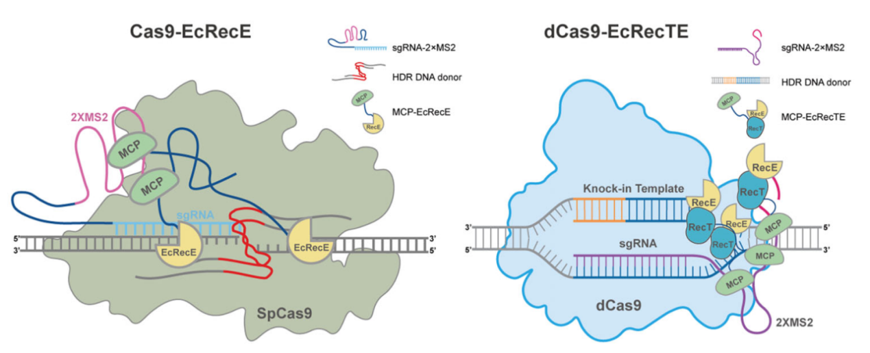 在该项研究中,作者筛选到EcRecE可作为一种高效的HDR增强因子,评估了Cas9/EcRecE偶联系统在不同细胞系和原代细胞中的HDR增强能力,并对该系统进行了进一步优化和安全性评估。结果显示:EcRecE可将各类细胞中的HDR效率提高2-4倍,并且与单独使用Cas9相比具有更高的精准性。作者随后结合蛋白质工程获得了尺寸最短但效率最高的RecE变体。结合课题组之前开发的REDIT和dCas9-SSAP技术(Wang et al., 2021,Nucleic Acids Research; Wang et al., 2022, Nature cell biology),作者将截短的RecE与RecT融合,分别构建了Cas9-miniRecE/T、Cas9n-miniRecE/T和dCas9-miniRecE/T系统。结果表明,这些系统均可在细胞中实现高效大片段基因敲入。其中,dCas9-miniRecE/T系统能够在不形成DNA单链/双链断裂的条件下实现高于野生型Cas9的基因敲入效率,这对于精准基因治疗具有重要意义。最后,作者将miniRecE/T系统应用于人类胚胎干细胞和小鼠原代神经元。另外,由于miniRecE/T尺寸很小,作者将其与Cas9一起包装到腺病毒,并在多个细胞内源性位点实现高效大片段DNA敲入。