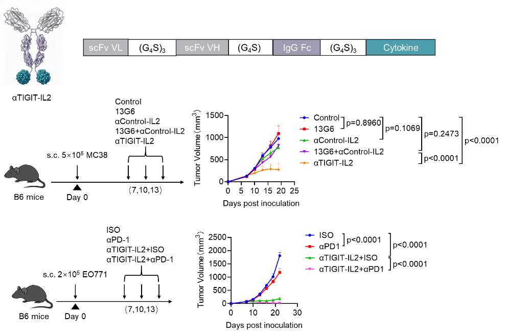 在该研究中,科研团队利用基因工程融合技术,将IL-2分子与抗TIGIT单克隆抗体(13G6)的单链可变片段通过linker连接,构建出双功能融合蛋白αTIGIT-IL2。体外实验证明,其理化性质与活性均与母抗体相当。在包括对免疫检查点阻断(ICB)疗法耐受的三阴性乳腺癌(TNBC)在内的多种体内肿瘤模型中,αTIGIT-IL2均展示出强大的抗肿瘤效应,以及与抗PD-1抗体协同效应。