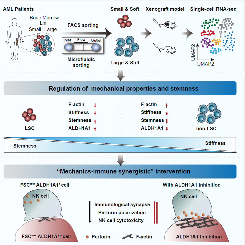 2025年12月1日,中国科学技术大学生命科学与医学部、免疫应答与免疫治疗全国重点实验室倪芳教授与中国科学技术大学工程科学学院近代力学系姜洪源教授团队合作在《Nature Communications》在线发表题为“Targeting leukemic stem cell biomechanics suppresses stemness and enhances NK cell mediated immunotherapy”的研究论文。该研究系统揭示了AML中LSCs独特的物理力学特性,并创新性地提出通过调控其力学性质来增强免疫治疗效果的联合治疗新策略,为克服AML耐药与复发难题提供了全新视角和潜在途径。