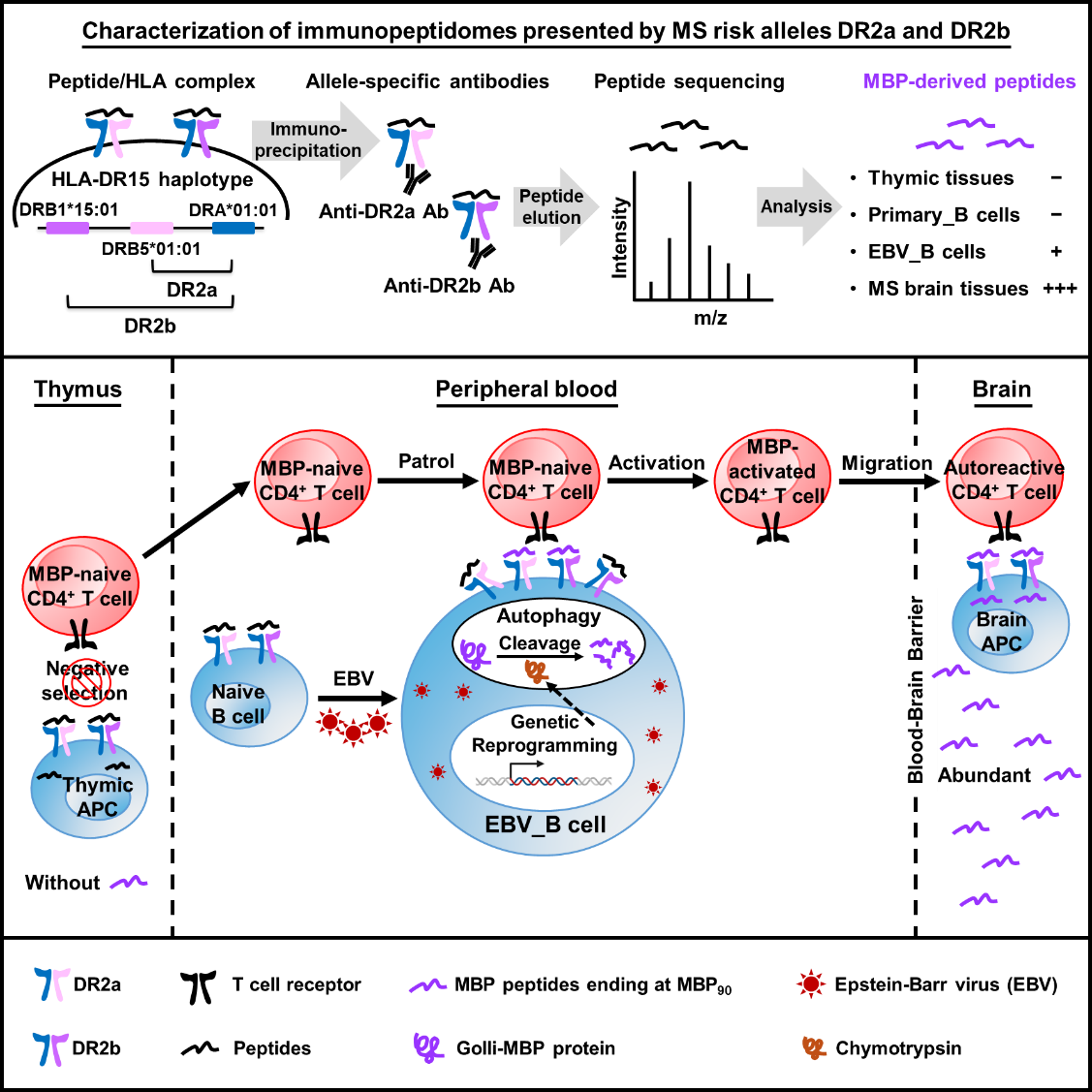 2026年1月14日,中国科学技术大学生命科学与医学部、免疫应答与免疫治疗全国重点实验室王剑教授课题组与苏黎世大学Roland Martin教授课题组合作在《Cell》期刊在线发表题为“EBV Infection and HLA-DR15 Jointly Drive Multiple Sclerosis by Myelin Peptide Presentation”的研究论文。该研究通过免疫多肽谱分析和自身反应性CD4+ T细胞功能鉴定,揭示了爱泼斯坦-巴尔病毒(EBV)感染与人类白细胞抗原HLA-DR15协同作用,通过呈递髓鞘自身抗原多肽并激活自身反应性CD4+ T细胞,共同驱动多发性硬化症(MS)发生的新机制。